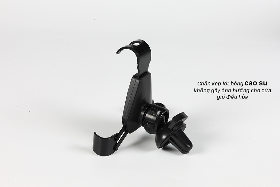 Chân đế kẹp được gắn chắc chắn trên khe điều hòa và giá đỡ giữ điện thoại cố định chắc chắn khi xe di chuyển.